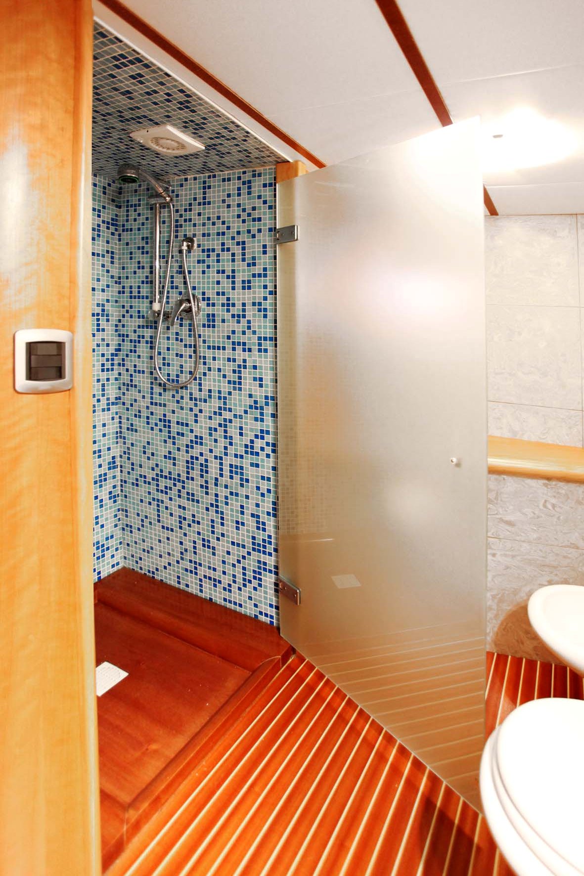 Guests rooms have private bathrooms and include 4 double spacious and elegant “Master” staterooms, equipped with television, and 1 twin cabins with L shaped beds, all spacious and comfortable 2 double cabins with sofa beds suitable for children.