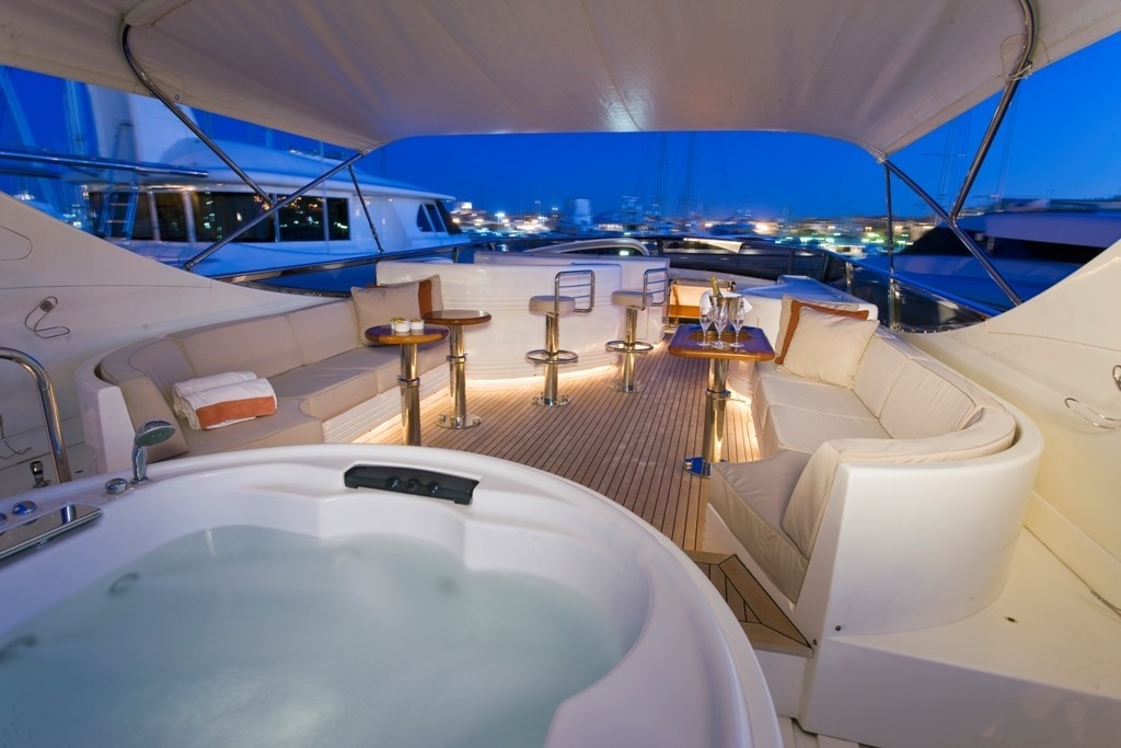 The flybridge features port and starboard guests seating, a complete wet bar with stools, cocktail tables, Jazuzzi tub and chaise lounges. A fold down Bimini frame allows for shade, sun and idyllic star gazing.