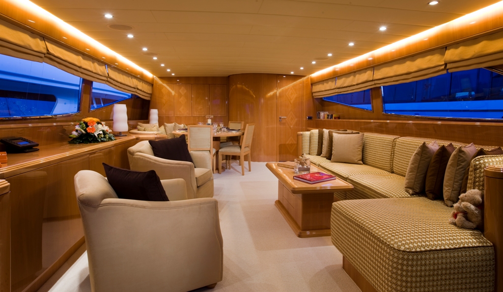 The salon and dining are an open plan and feature lovely warm high gloss wood panels, large panoramic windows and a serene ambiance. An L shaped sofa and coffee table sits to starboard with 2 occasional chairs to port. Forward of the lounge is a formal dining table.