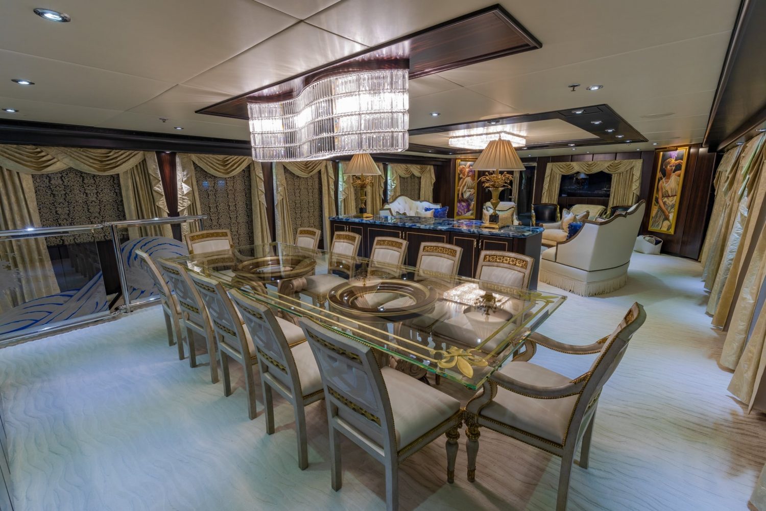 The main salon is generous and boasts the lounge aft, with a low island credenza separating the formal dining area forward. Thanks to the almost full-length vertical windows, the salon is light and airy, optional privacy blinds create an intimate ambience.