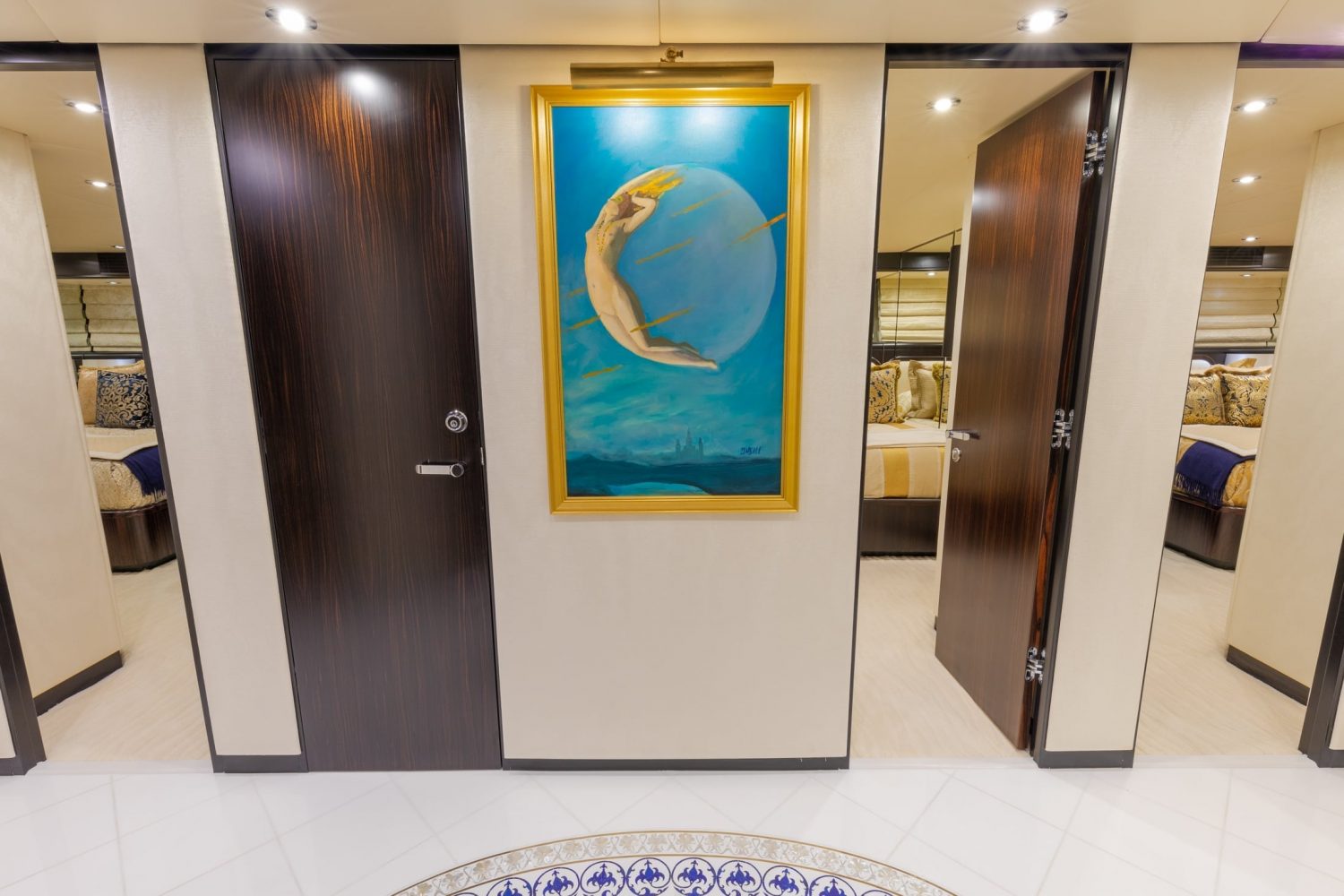 This yacht boasts a spacious sky lounge with elongated vertical windows, ideal for entertaining and relaxing. A large L shaped sofa, coffee table, study desk and marble-topped wet bar invites both an elegant ambience and casual entertainment area.