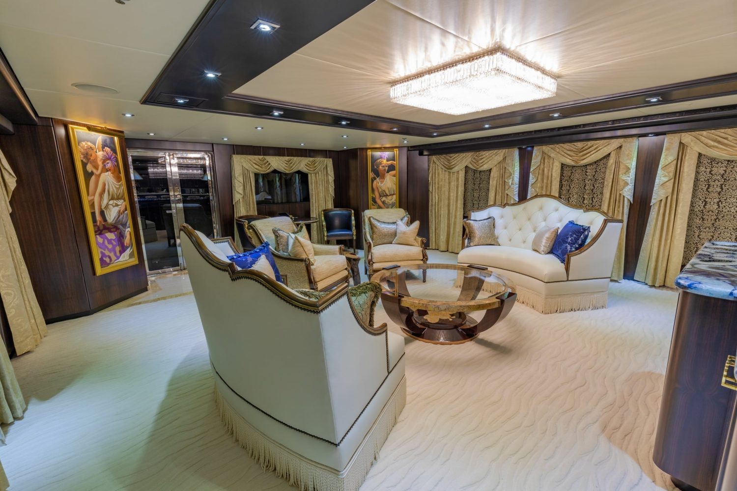 The main salon is generous and boasts the lounge aft, with a low island credenza separating the formal dining area forward. Thanks to the almost full-length vertical windows, the salon is light and airy, optional privacy blinds create an intimate ambience.