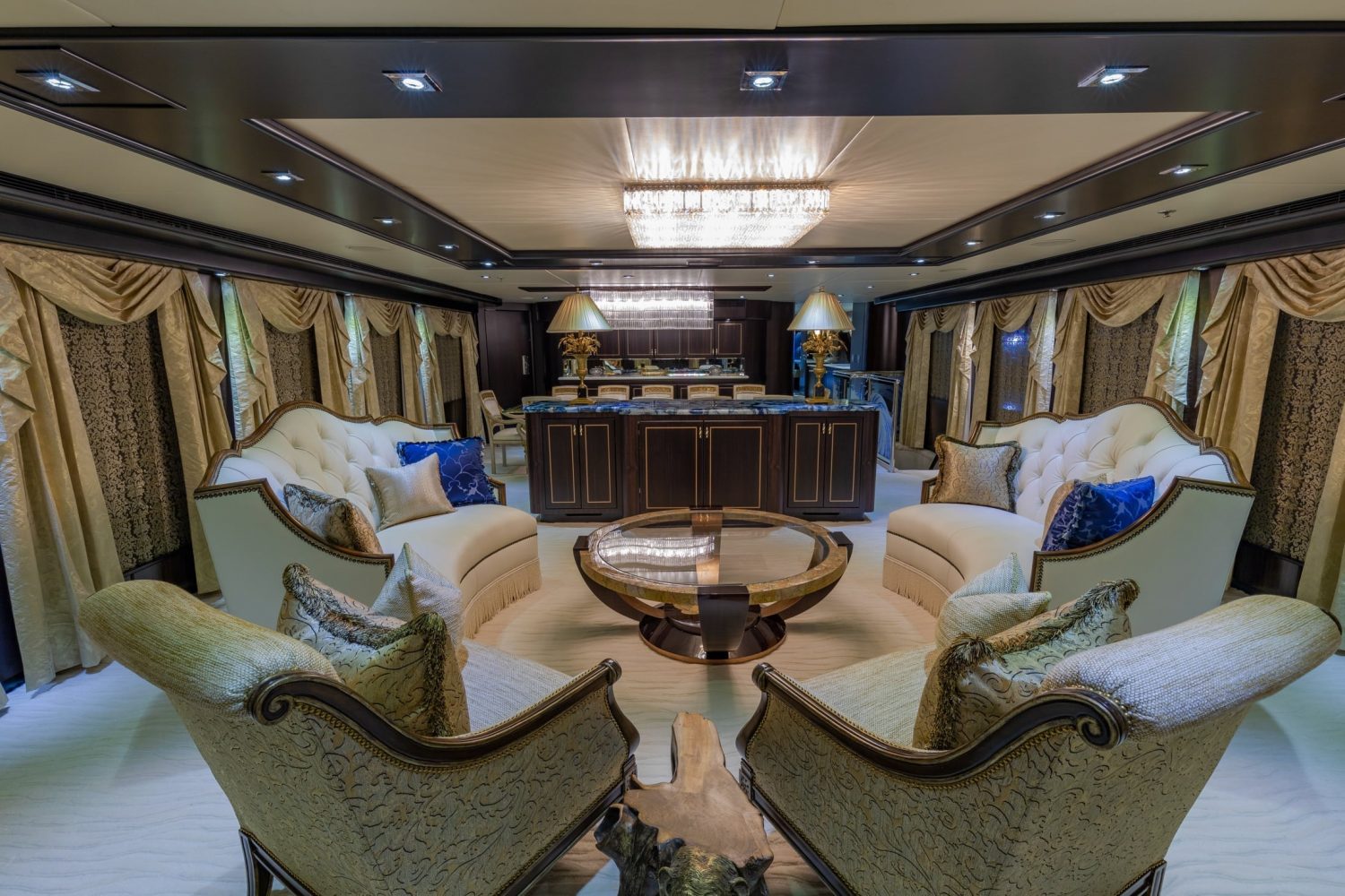 The main salon is generous and boasts the lounge aft, with a low island credenza separating the formal dining area forward. Thanks to the almost full-length vertical windows, the salon is light and airy, optional privacy blinds create an intimate ambience.