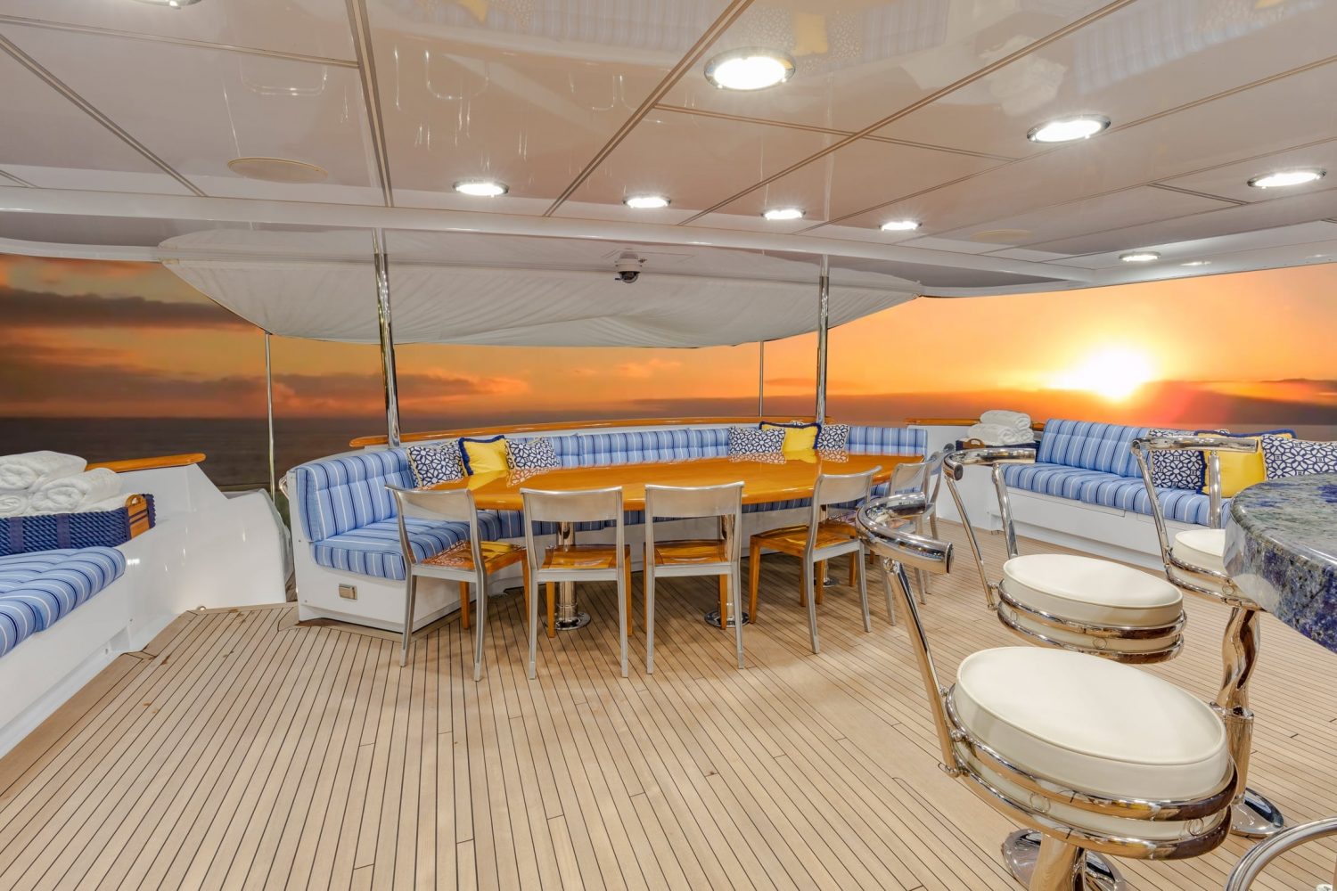 This yacht boasts a spacious sky lounge with elongated vertical windows, ideal for entertaining and relaxing.