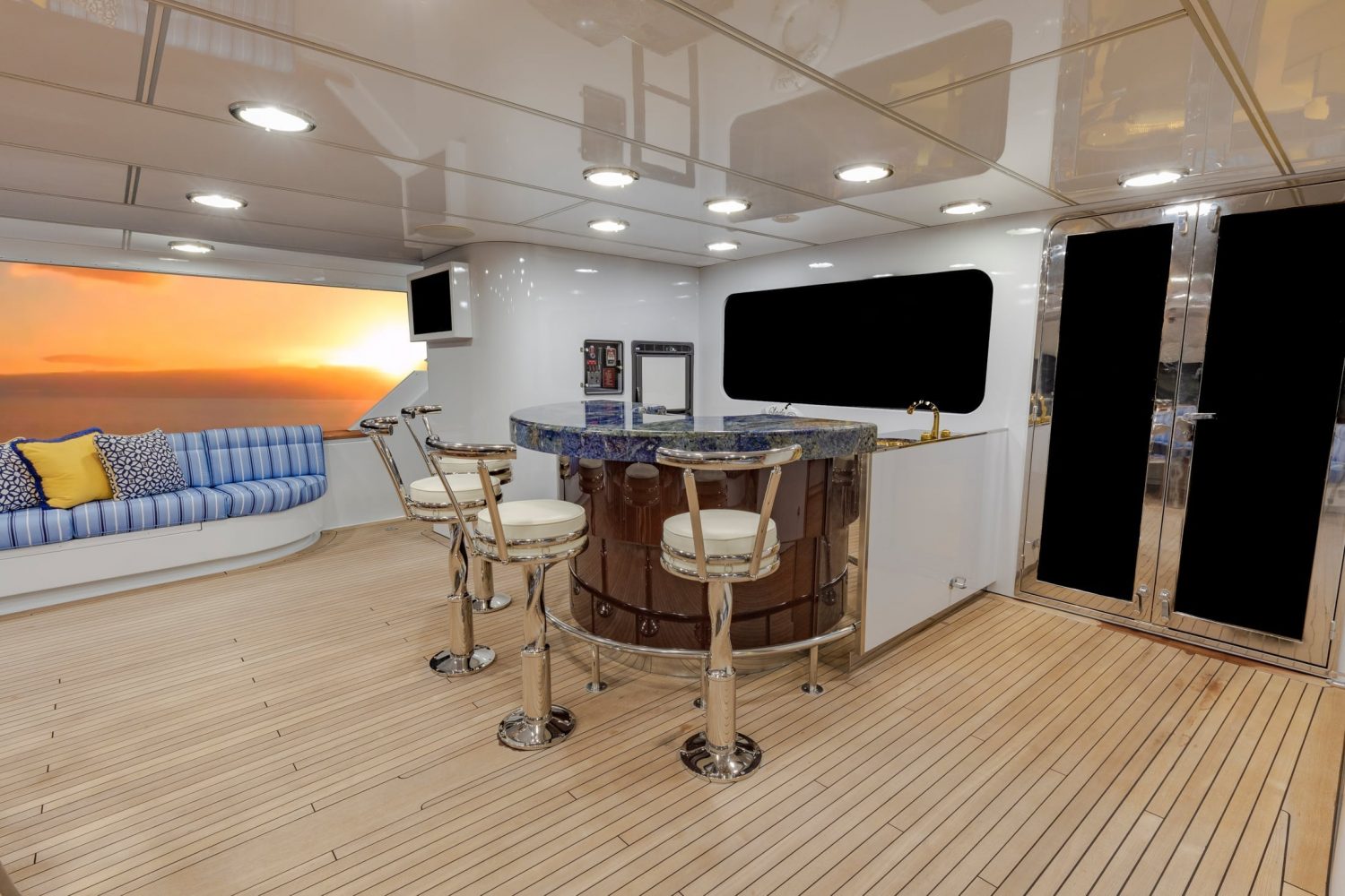Aboard, guests have ample exterior deck space to relax. The aft deck is generous and boasts comfortable seating with three outdoor sofas, an alfresco dining option, a wet bar and shade. For a more relaxed atmosphere, the sundeck is complete with alfresco dining, additional seating and a deluxe Spa Pool tub.