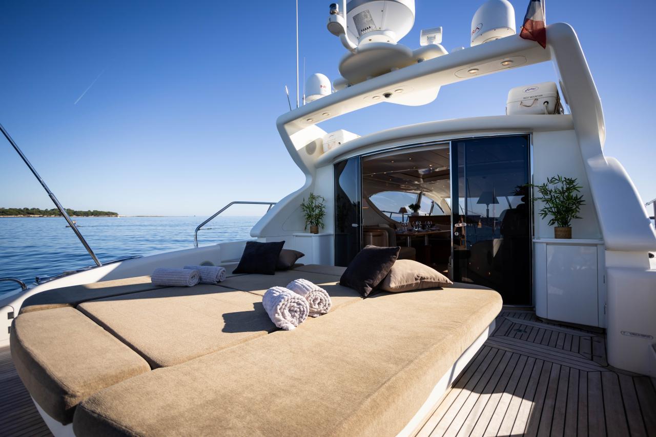 The aft deck boasts a large sunpad which can convert into an alfresco dining table, a generous full beam swim platform is perfect for making the most of the selection of water toys aboard, while forward a massive sunpad offers ...