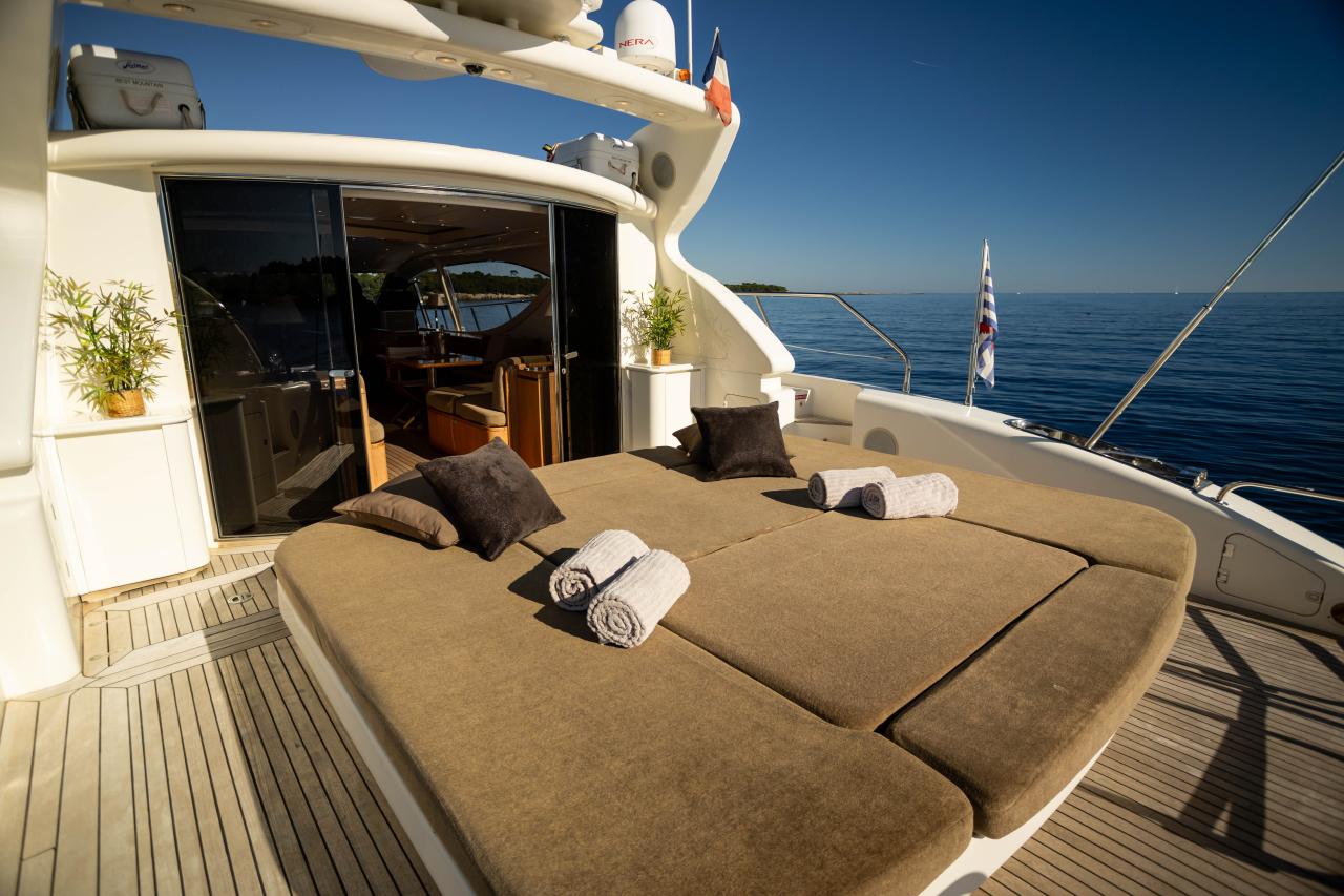 The aft deck boasts a large sunpad which can convert into an alfresco dining table, a generous full beam swim platform is perfect for making the most of the selection of water toys aboard, while forward a massive sunpad offers ...