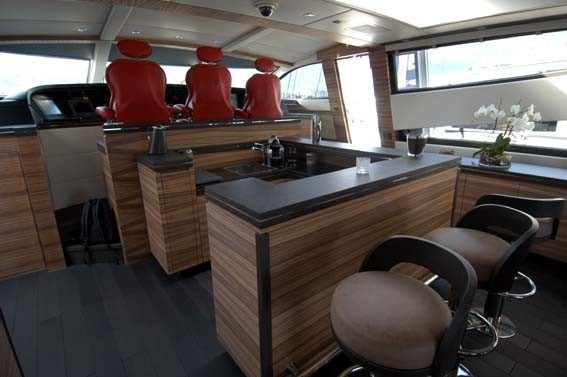 Side walkways lead along the main deck to the foredeck, where there is another C-shaped sofa ...