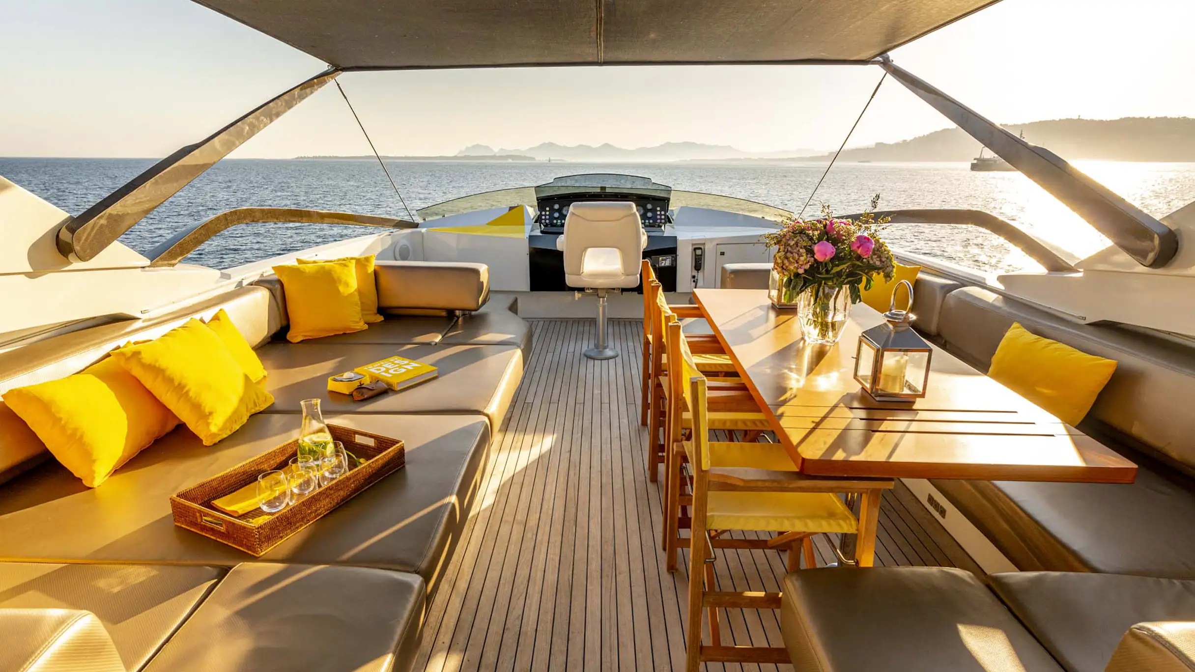 Aft of the salon, sliding glass doors open to the spacious shaded aft deck and alfresco dining option. Steps on port and starboard make access to the lowering swim platform and water toys garage effortless. Wrap around teak decks lead to the ample foredeck, seating and double sunpad.