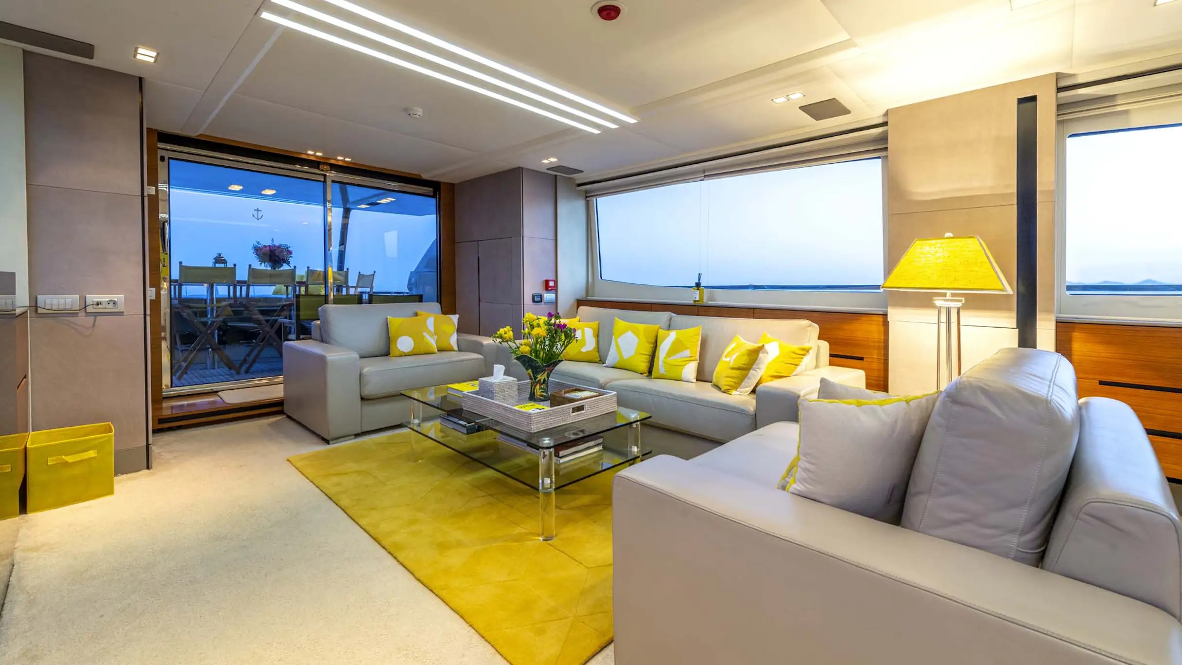Aft of the salon, sliding glass doors open to the spacious shaded aft deck and alfresco dining option. Steps on port and starboard make access to the lowering swim platform and water toys garage effortless. Wrap around teak decks lead to the ample foredeck, seating and double sunpad.