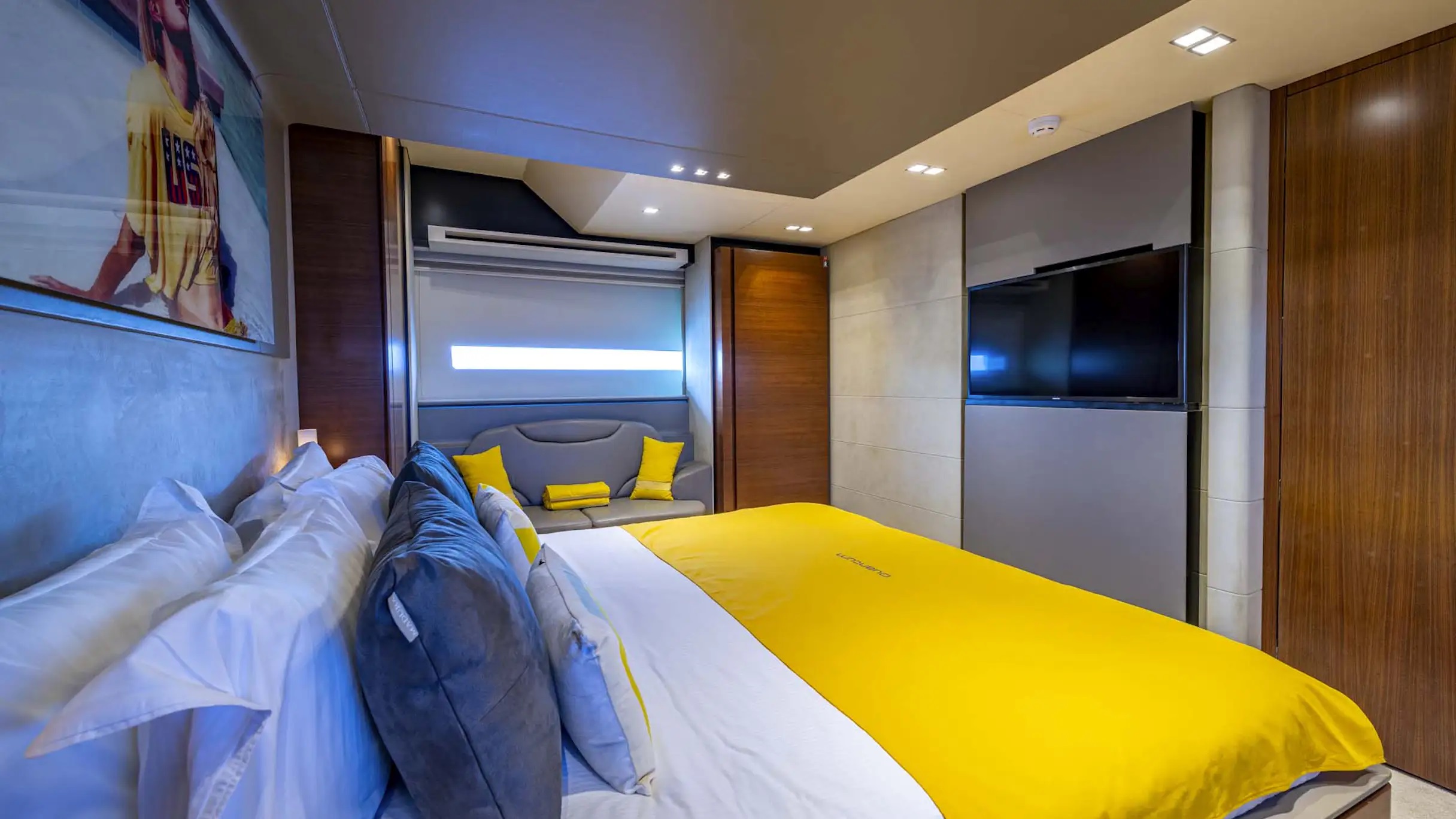 The master suite is full beam of the yacht amidships with a center lined double bed, sofa and en-suite with his and hers sinks and spa bath. The VIP cabin is full beam of the yacht forward, featuring a center lined double bed, walk in wardrobe and en-suite facilities with his and hers sinks and shower stall.