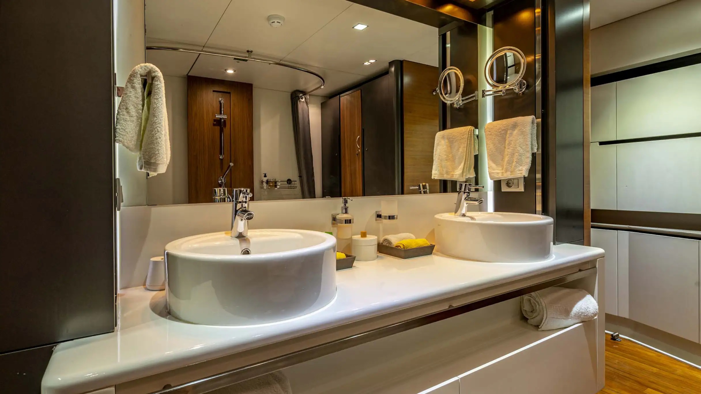 The master suite is full beam of the yacht amidships with a center lined double bed, sofa and en-suite with his and hers sinks and spa bath. The VIP cabin is full beam of the yacht forward, featuring a center lined double bed, walk in wardrobe and en-suite facilities with his and hers sinks and shower stall.