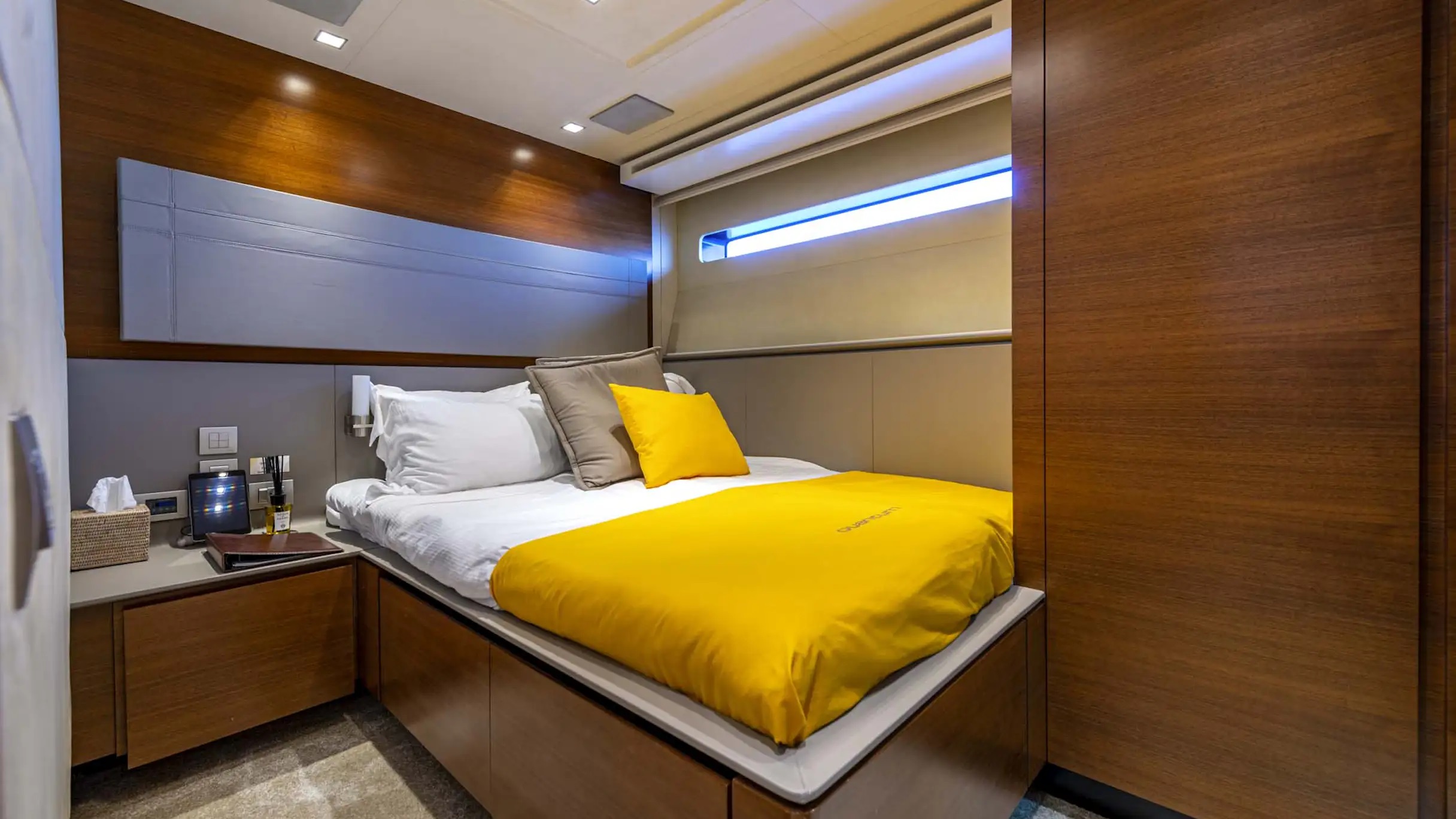 The master suite is full beam of the yacht amidships with a center lined double bed, sofa and en-suite with his and hers sinks and spa bath. The VIP cabin is full beam of the yacht forward, featuring a center lined double bed, walk in wardrobe and en-suite facilities with his and hers sinks and shower stall.