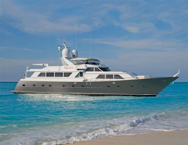 Luxury motor yacht TRILOGY was built by the American based shipyard Broward Marine in 1988 and measures 31m (103ft). The yacht underwent refits in 2008/10/11. Crewed charter yacht TRILOGY offers deluxe accommodation for up to 6 guests in 3 double, en-suite cabins.