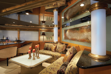 The salon and dining are an open plan enabling a unique multipurpose layout. The lounge has ac comfortable large sofa, occasional chairs and coffee tables. Just forward of the salon before the dining table is a complete marble topped wet bar.