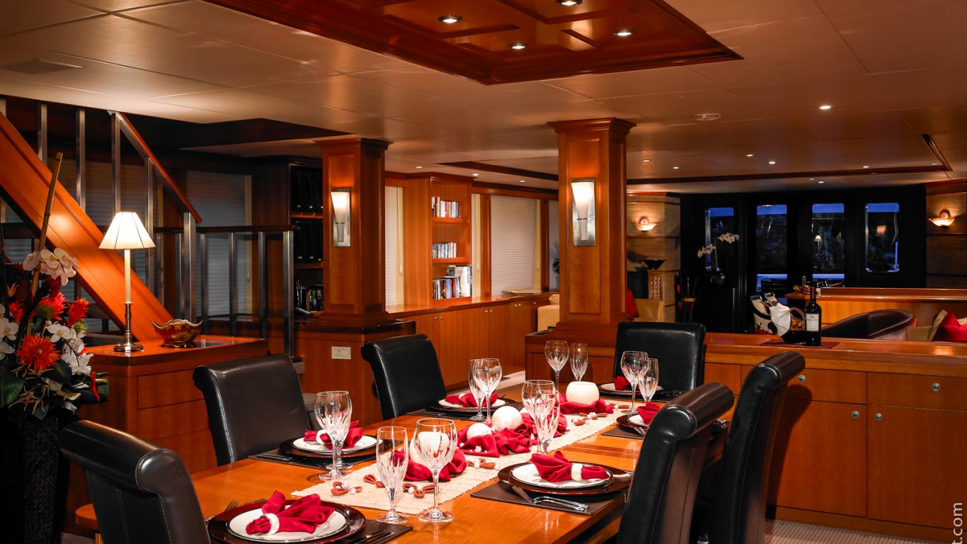 Forward of the salon and casually separated by a low crezenda and fine cherry pillars, is the formal dining space. The MURPHY’S LAW motor yacht offers an alfresco dining option on the shaded aft deck, followed by an extended ...