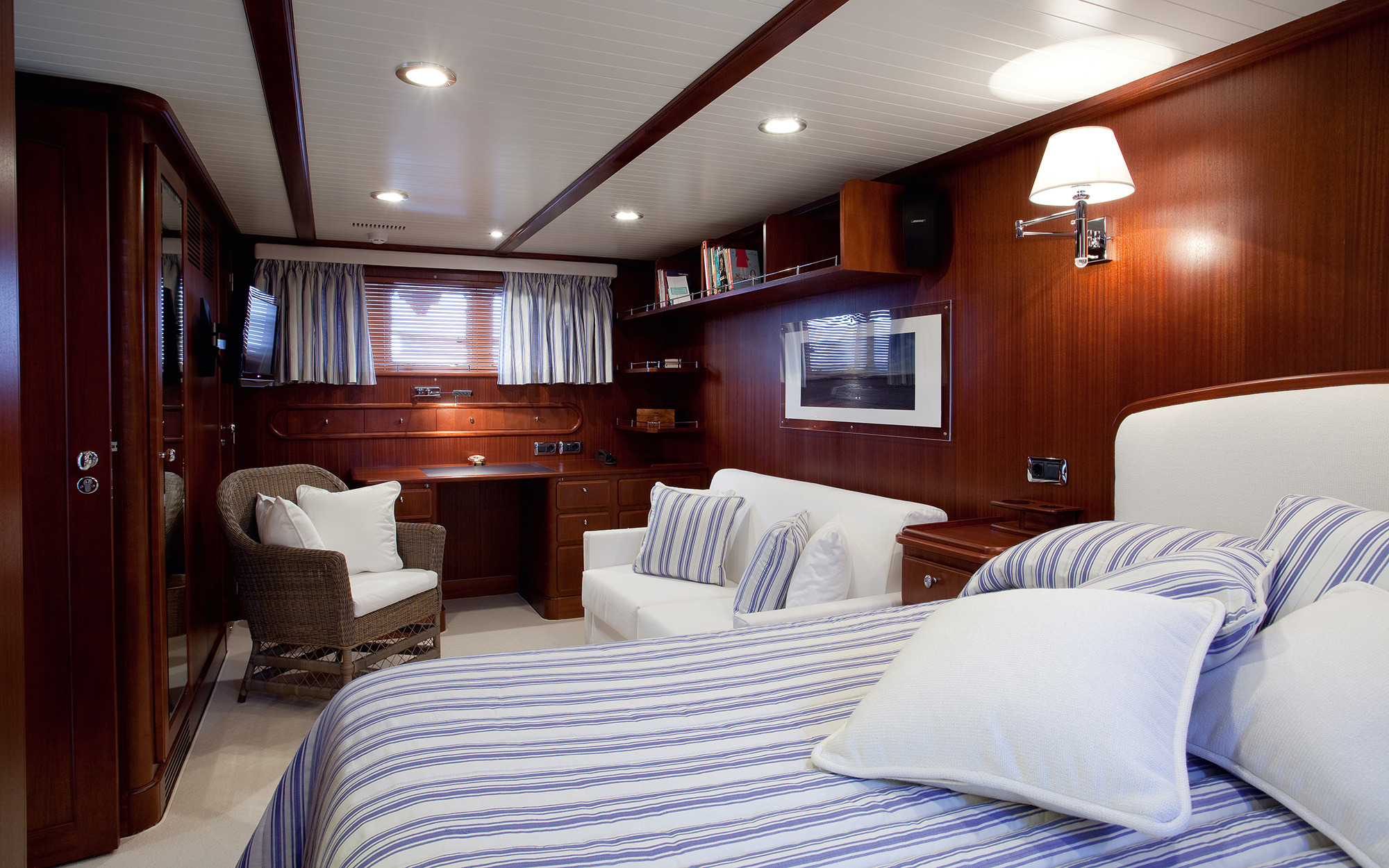 She is able to accommodate 10 guests in 4 cabins located below decks including a master cabin with a double bed along with three twin bedded cabins.