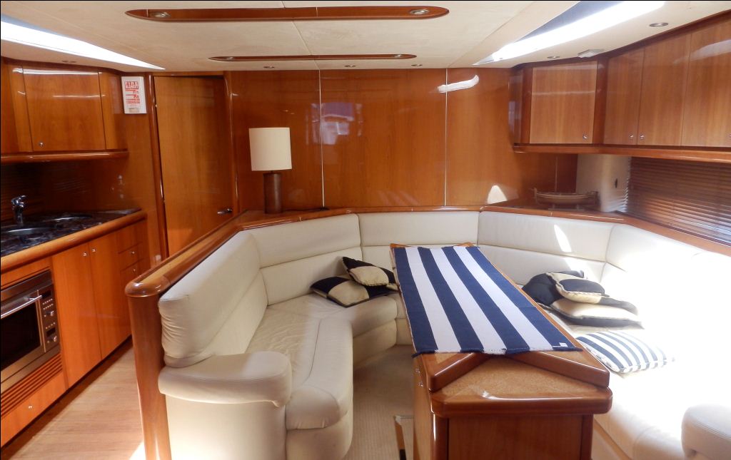 Charter yacht LARA SOFIA III’s cockpit or main deck salon is lit with natural light thanks to the large windows. There is a u shaped settee and table for dining as well as a bar. Twin helms are located forward. The lower salon is finished in a warm cherry wood and has another us shaped settee and dining table.