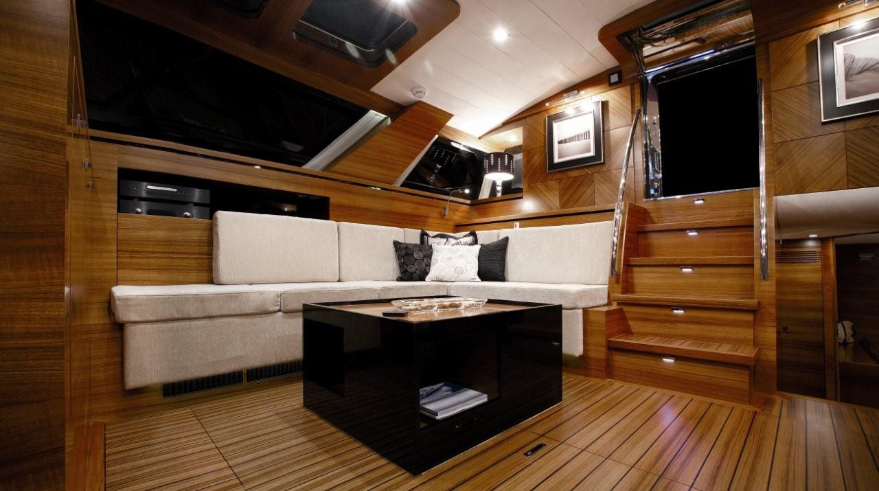 The 24 sqm living space consists of the salon and dining area that is open plan offering a large formal dining table on the port side and comfortable lounge with entertainment on the starboard side. Overhead ports and hatches enhance the quality teak and supple cream décor, creating a spacious open feel.