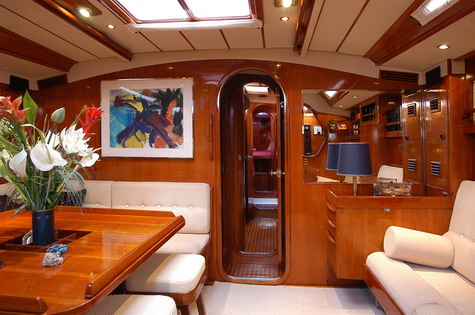 Below decks the salon and formal dining are in an open plan with crisp white soft furnishings, high gloss wood panels and teak and holy inlaid floors creating a warm, inviting ambiance. Forward of the salon are 3 guest cabins, 1 double and 2 twins with option double conversions.