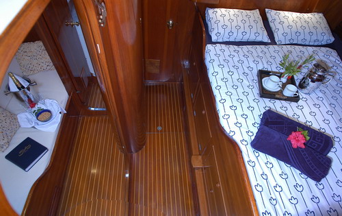 Forward of the salon are 3 guest cabins, 1 double and 2 twins with option double conversions. Plenty of overhead hatches, and ports provide natural light and fresh sea breezes.
