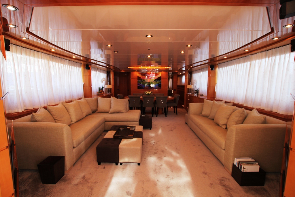 The salon and dining is set in an open plan, aft the salon features 2 large neutral toned sofas, light carpeting and high gloss warm woods, forward the formal dining space boasts a beautiful oval table with custom earthy coloured ...