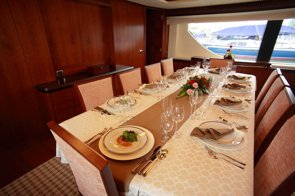 Her spacious salon is ideal for relaxing and she has a separate dining area further forward. There is a cozy sky lounge on the upper deck with comfortable sofas and a large flat screen TV, where guests can enjoy a quiet moment or relax with a film.