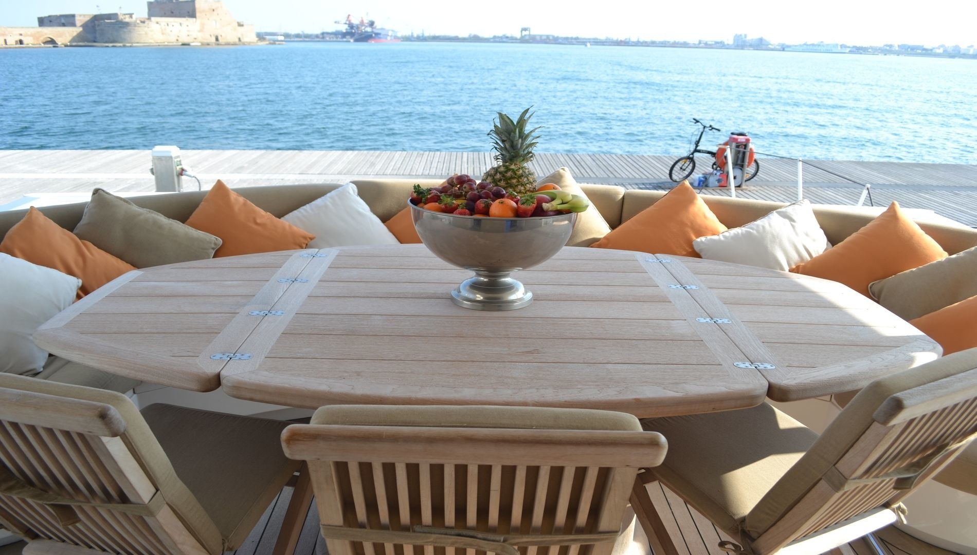 The aft deck is shaded and generous with an alfresco dining option, custom built in seating and provides easy access to the extended swim platform and water toys. Forward on the main deck a large sunpad and custom seating is a great escape.