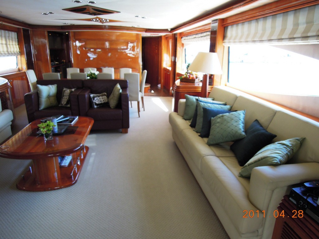 The main salon and dining are an open plan with generous areas to relax, featuring fine high gloss cherry woods, deluxe leather soft furnishings and welcoming cream carpets. The lounge is aft and offers 2 leather sofas, 2 occasional chairs a complete wet bar and full entertainment center.