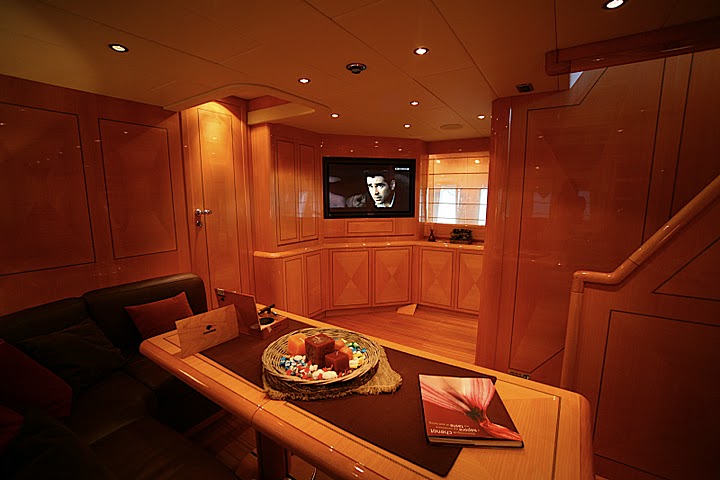 The main salon is below decks and features a large U shaped chocolate brown leather sofa with formal adjustable dining table, a full state of the art visual and audio system ensures optimum entertainment.