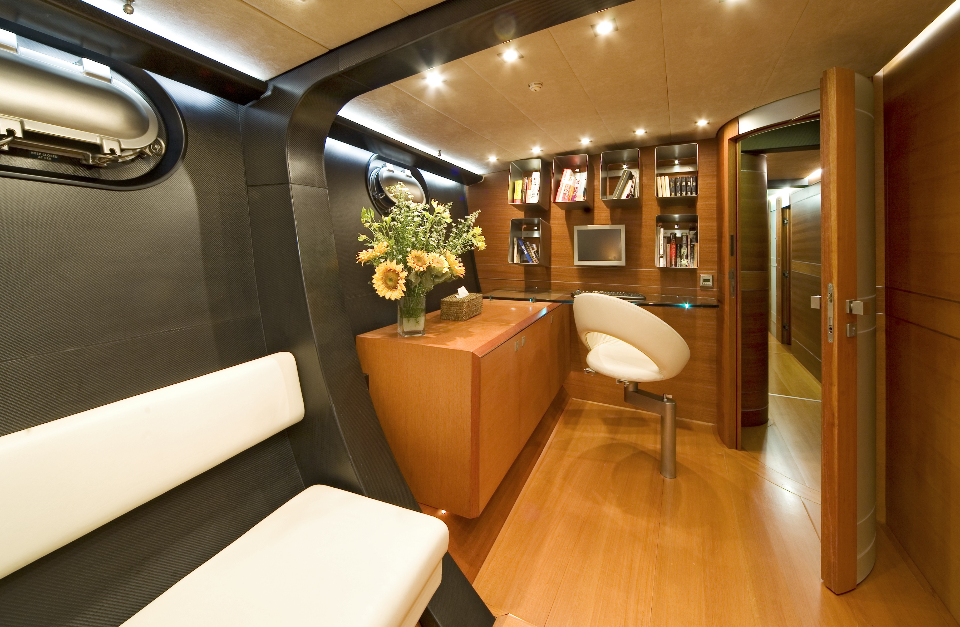 Her interior décor is contemporary and elegant, featuring timeless mahogany woods, stylish stainless steel fittings and plush leather soft furnishings.