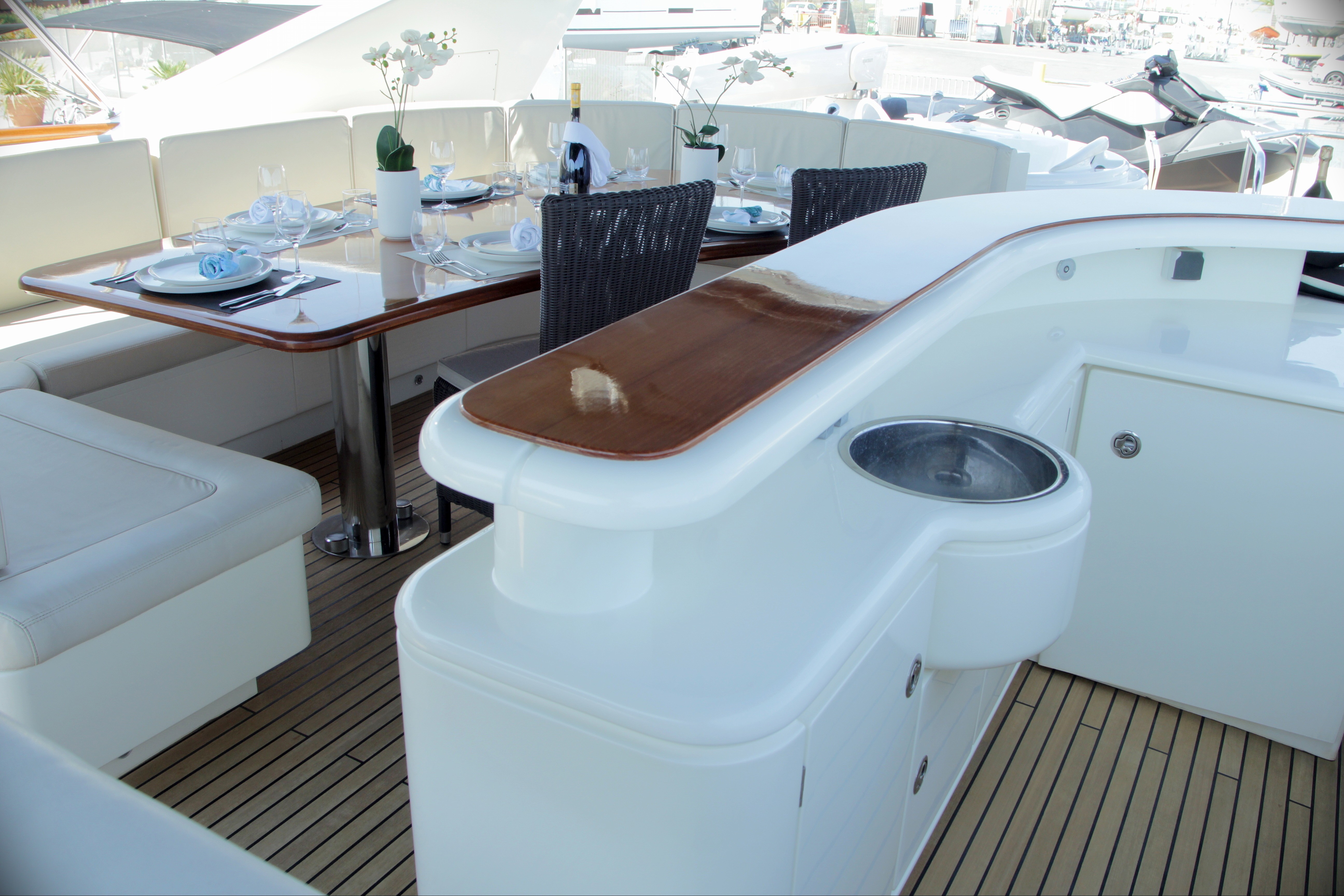 The master suite features a double bed, sofa, his and hers sinks, en-suite facilities and spa tub, the VIP cabin offers a double bed and en-suite facilities with shower, a further 2 double guest cabins offer double beds and en-suite facilities. 1 Pullman berth is available for a ninth guest.