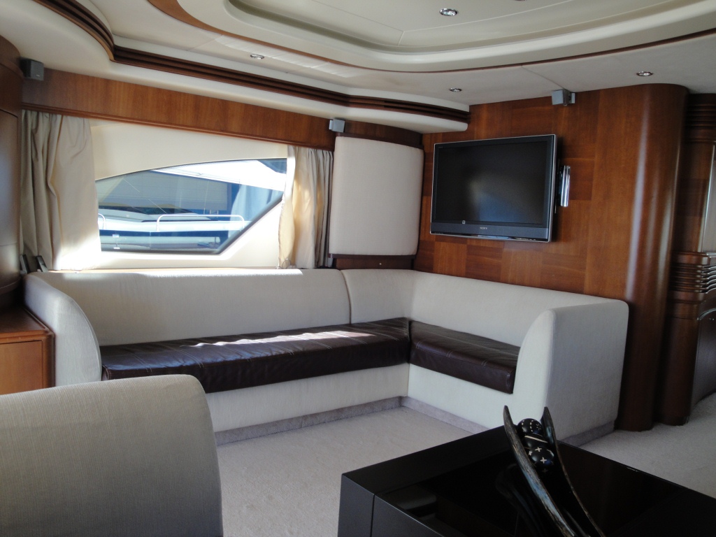 The salon features large leather sofas, coffee table and massive flat screen TV with entertainment center, ideal for indoor entertainment. Forward of the salon the formal dining area seats 8 guests at a stylish clear glass table with cream high back chairs.