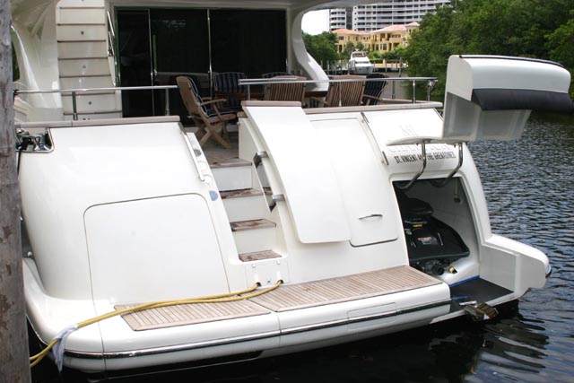 A gate and steps lead to the extended swim platform and water toys garage, including a Wave Runner. For a more intimate escape, head to the foredeck where a double sunpad awaits. Outdoor entertainment aboard the M/Y MI CHAMPION continues onto the large flybridge, complete with alfresco dining table, seating, sunning areas and BBQ.