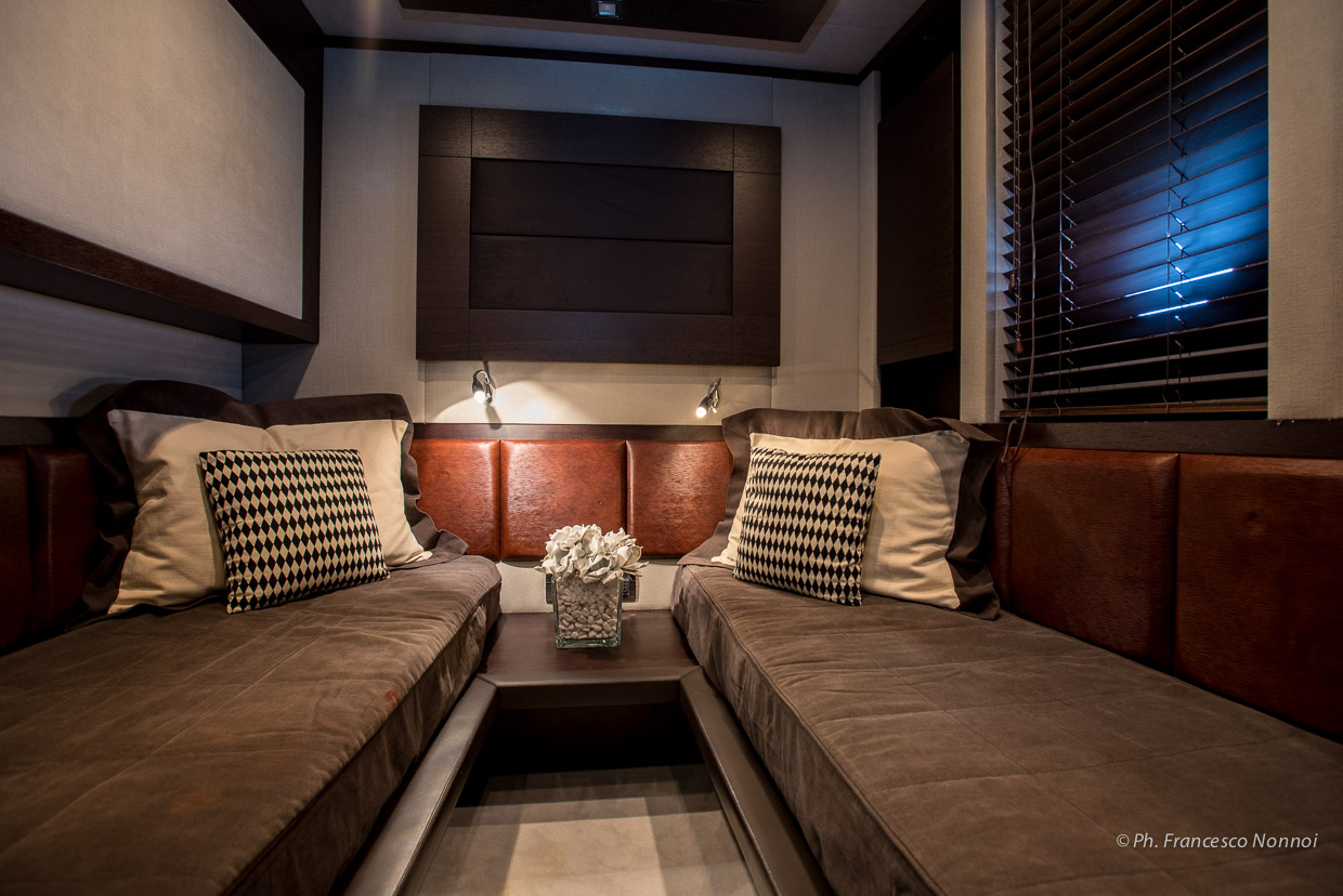 The aft deck is partially shaded and offers an alfresco dining option, wet bar service area, a large raised sunpad. Dual port and starboard steps lead effortlessly to the hydraulic lowering swim platform.
