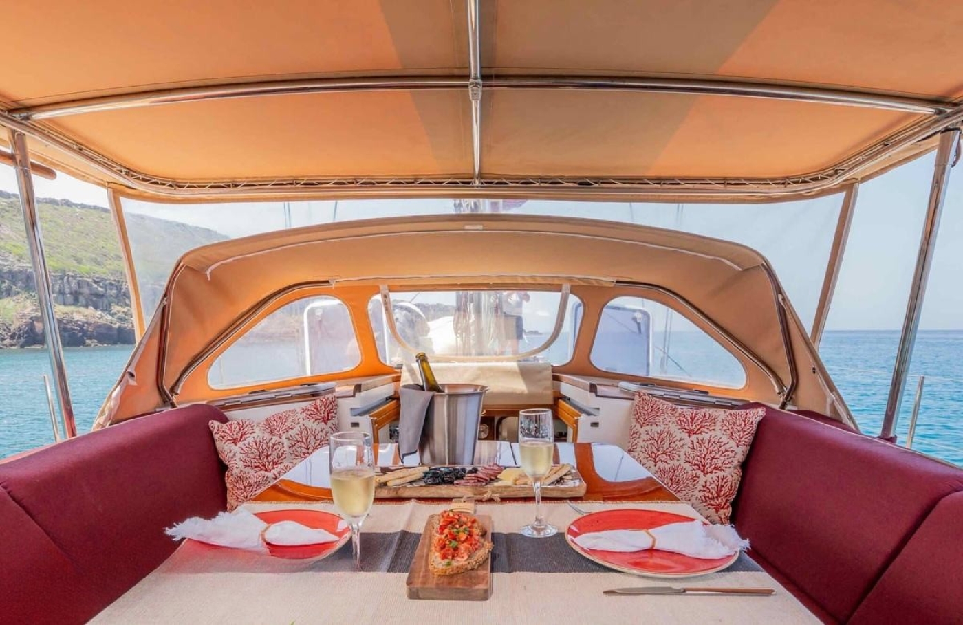 The main salon features a dining setting opposite a separate lounge setting with an adjacent galley. Wood panelling, natural light and bright soft furnishings create a warm and welcoming space.
