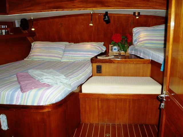 The Aft cabin has a queen size bunk measuring 80 inches by 60 inches on starboard and a single bunk measuring 80 inches by 32 inches to port. The usable floor space is approximately 27 square feet with a single large opening hatch and two opening ports along with individual fans and reading lights.