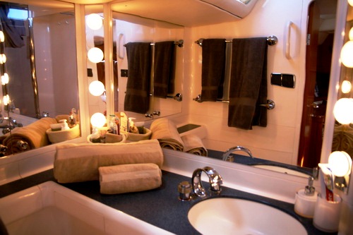 The master cabin also has a very large ensuite with walk-in shower. There are two port-side double cabins with single berth uppers and ensuite facilities that include walk-in showers.
