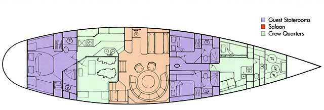 The sloop rigged COCONUT measures 24.4m (80ft), offering spacious accommodation for up to 6 guests in 3 en-suite cabins.