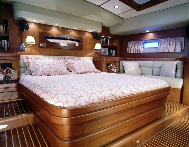 The master cabin features a comfortable lounge to starboard and mirrored dressing table.