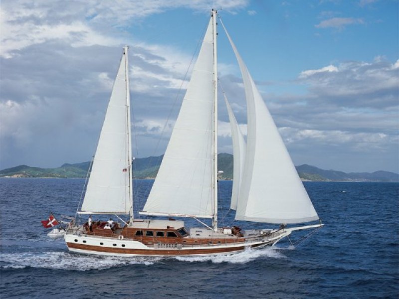 There is a ketch rigged yacht, she offers plenty of exterior living while under sail and at anchor, on the exquisite Burmese Teak decks. The aft deck has an alfresco dining option with built in seating, perfect for 8 guests to dine in comfort.