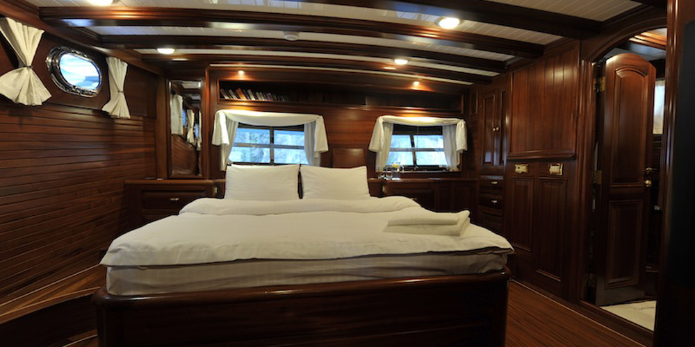 The salon and dining are an open plan in a raised cabin house, featuring the formal dining to port and relaxing lounge to starboard. Panoramic windows allow ample natural light to infuse the space while creating an open airy ambience. Guest accommodation is fore and aft of the salon, in 4 double, en-suite cabins.