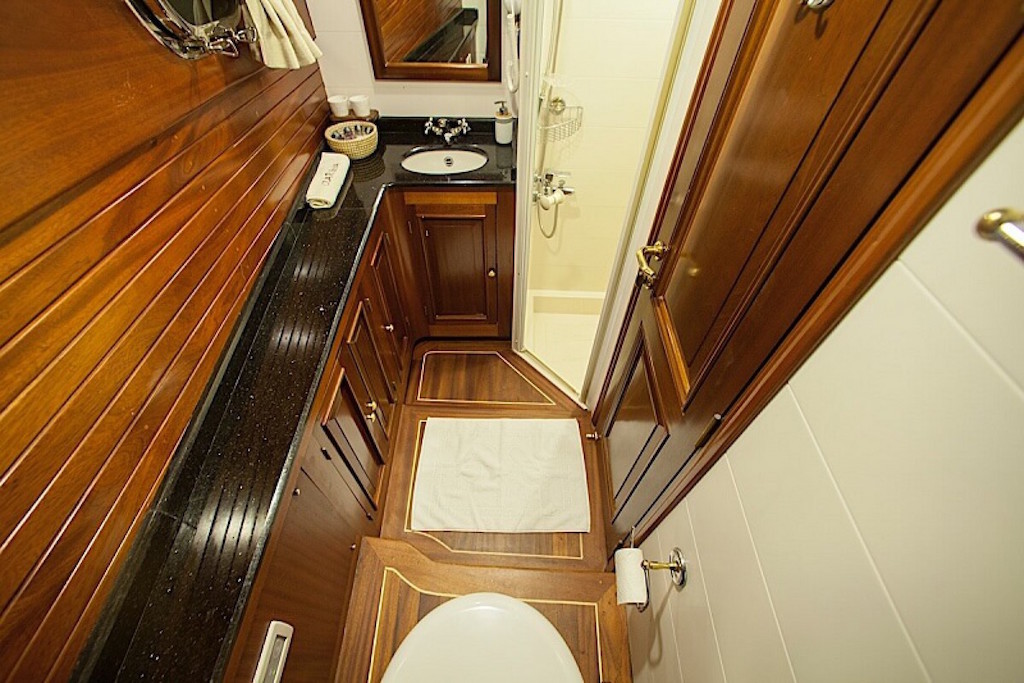 The salon and dining are an open plan in a raised cabin house, featuring the formal dining to port and relaxing lounge to starboard. Panoramic windows allow ample natural light to infuse the space while creating an open airy ambience. Guest accommodation is fore and aft of the salon, in 4 double, en-suite cabins.