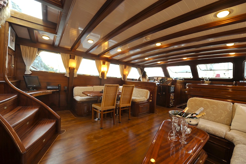 The salon and dining are an open plan in a raised cabin house, featuring the formal dining to port and relaxing lounge to starboard. Panoramic windows allow ample natural light to infuse the space while creating an open airy ambience. Guest accommodation is fore and aft of the salon, in 4 double, en-suite cabins.