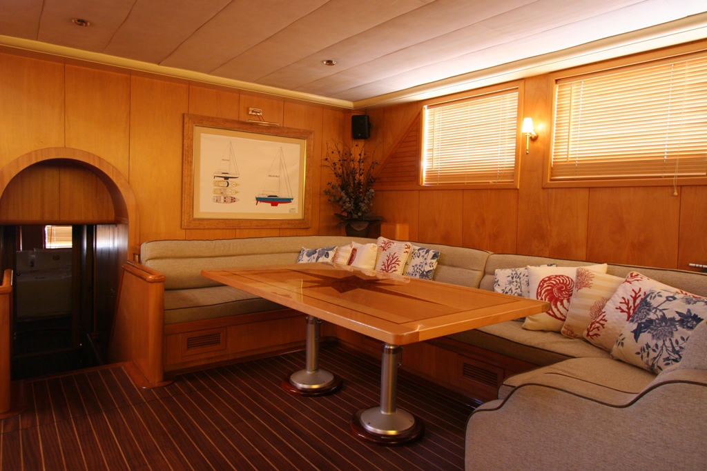 In the salon sailing yacht SCHATZ has a large U shaped sofa on the port side with formal dining table, on the starboard side is a pop up flat screen TV and entertainment system. Forward in the salon a complete wet bar is ideal for evening aperitifs.