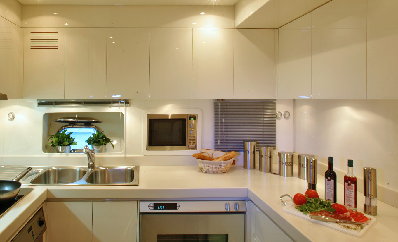 The large master stateroom is located amidship with private bathroom. There are two additional guests staterooms, one double (starboard) and one twin (port) with additional 3rd Pullman berth. Each cabin has en-suite facilities. There are separate crew quarters for captain, stewardess and deckhand.
