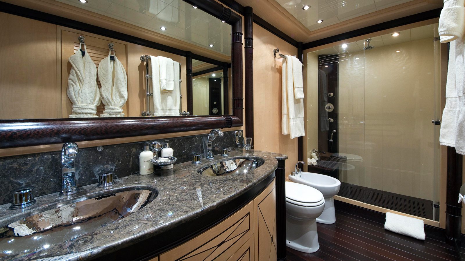 The Master stateroom is situated mid ship with a central King-size double bed. The master cabin boasts large portholes to port and starboard providing plenty of natural light. There is a Settee port side and a Vanity to starboard plus a small fridge.
