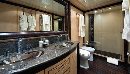The twin cabin is located on the port side and has two single beds and a pullman bed, a Samsung 22' Flatscreen HD TV and a Blue Ray DVD player. There is a closet and the en suite has a shower, a sink and a head.