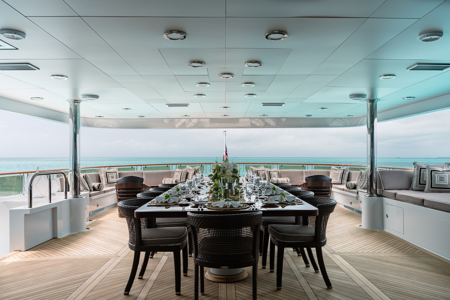 Her Bridge Deck Aft features a rectangular table that seats 12 comfortably, and her Portuguese Bridge has a built-in seating area with an occasional table and two large sun pads. Speaking of sun, the sundeck offers observation seating with large sun pads a seven-person Spa Pool, a full bar with four bar stools aft of the Spa Pool.