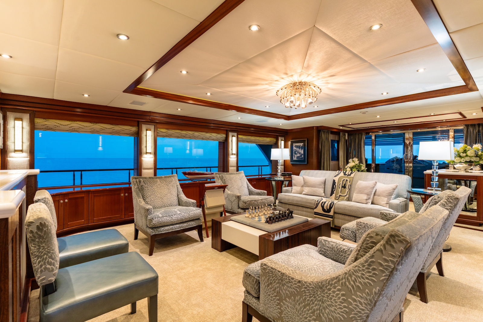 The main deck includes a full bar and formal dining for 12. Moving up, her Skylounge has an L-shaped bar area, a game table, and an L-shaped sofa and ottomans.